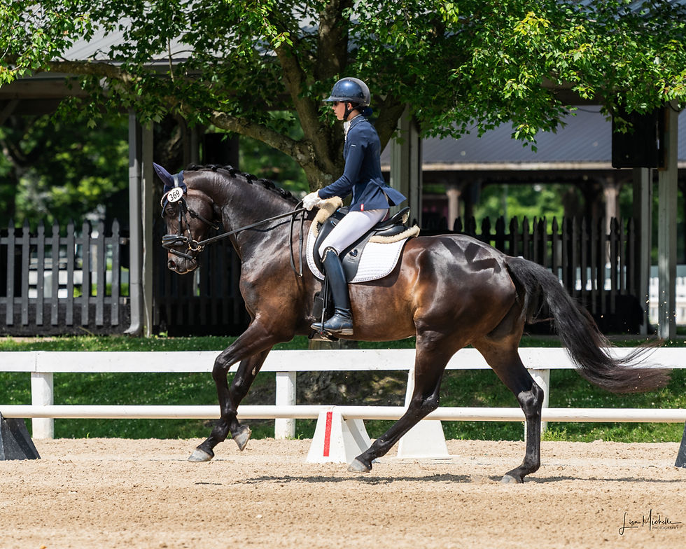Peach offers top gaits with a superb canter. She is showing an outstanding ability to sit and collect. She is schooling 2nd level movements with a start on half pass.